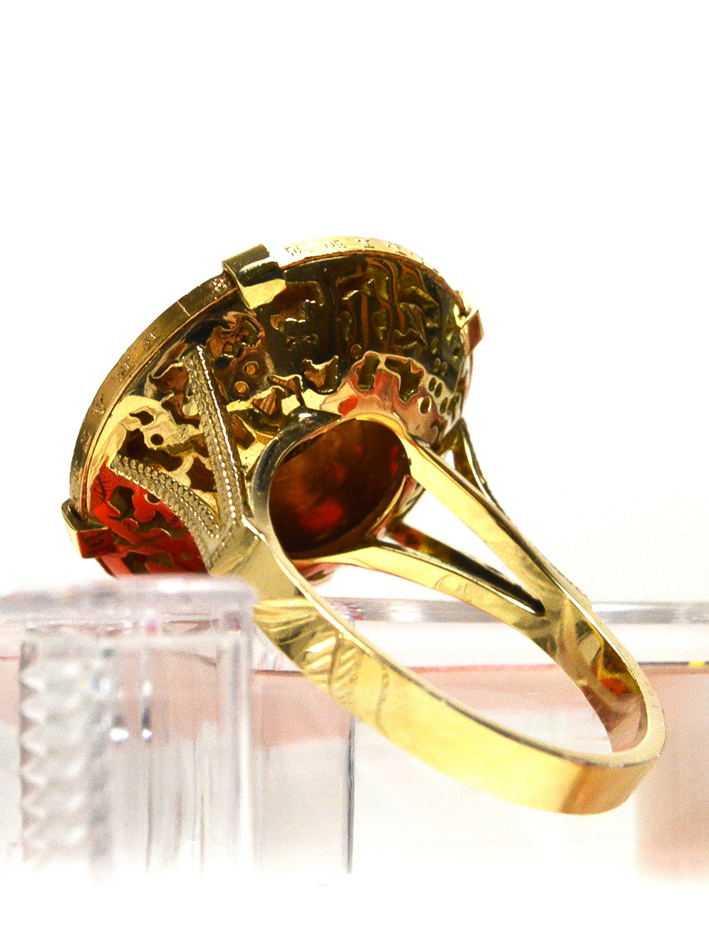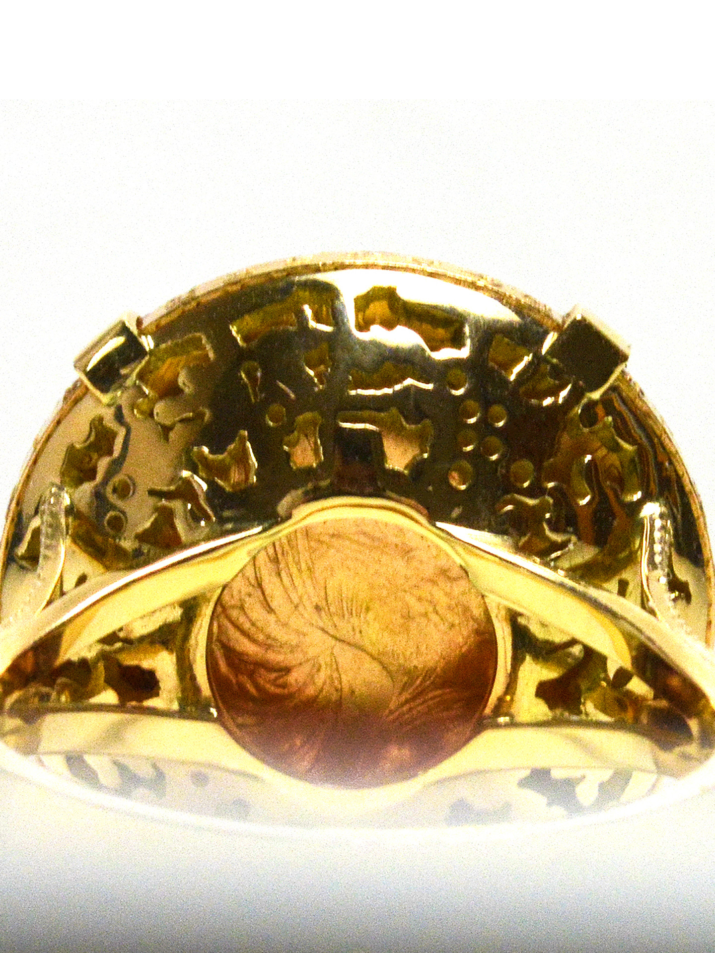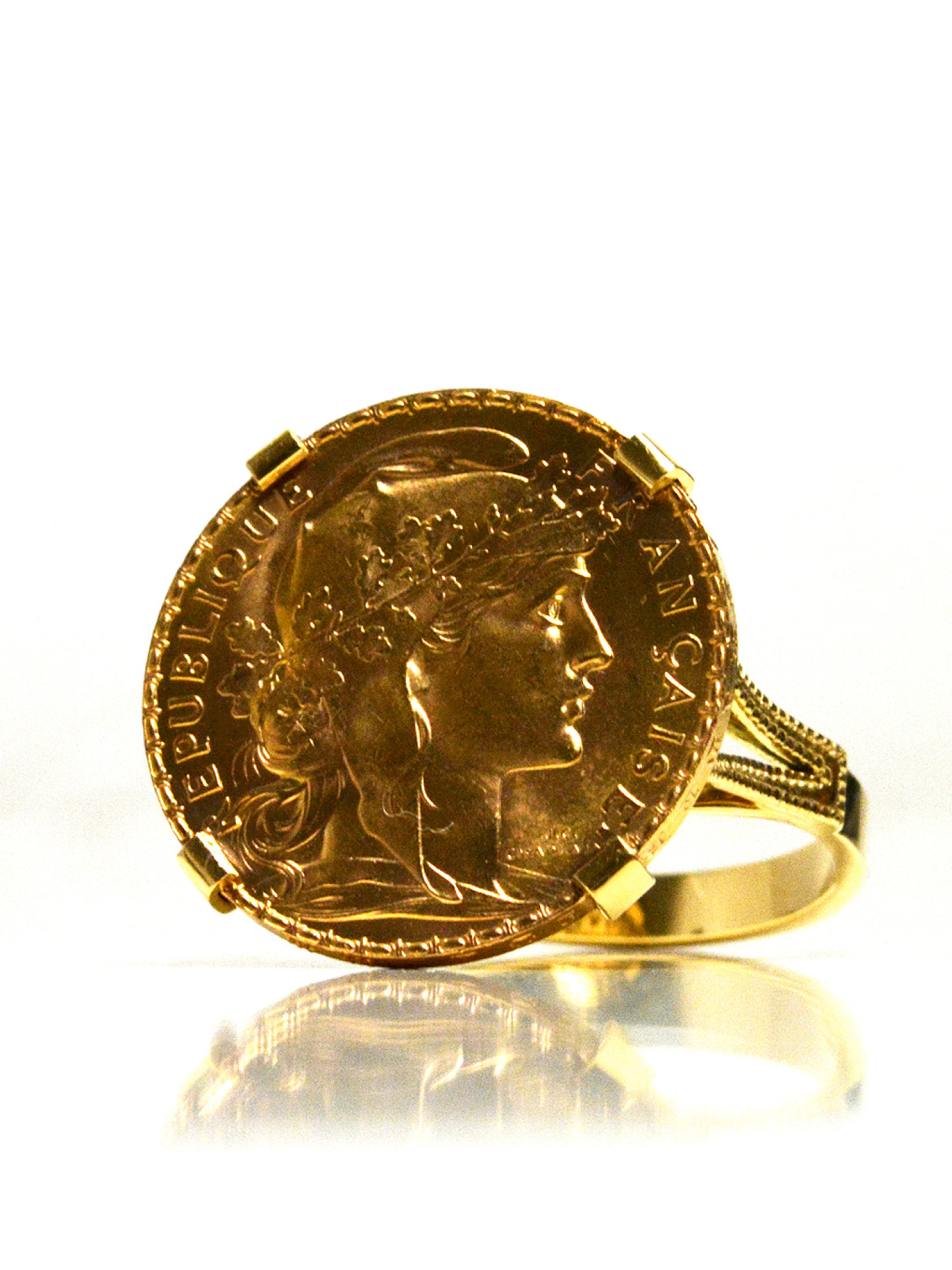 Gold ring setting for a Louis d’Or coin mounted on a pierced basket with 4 claws.